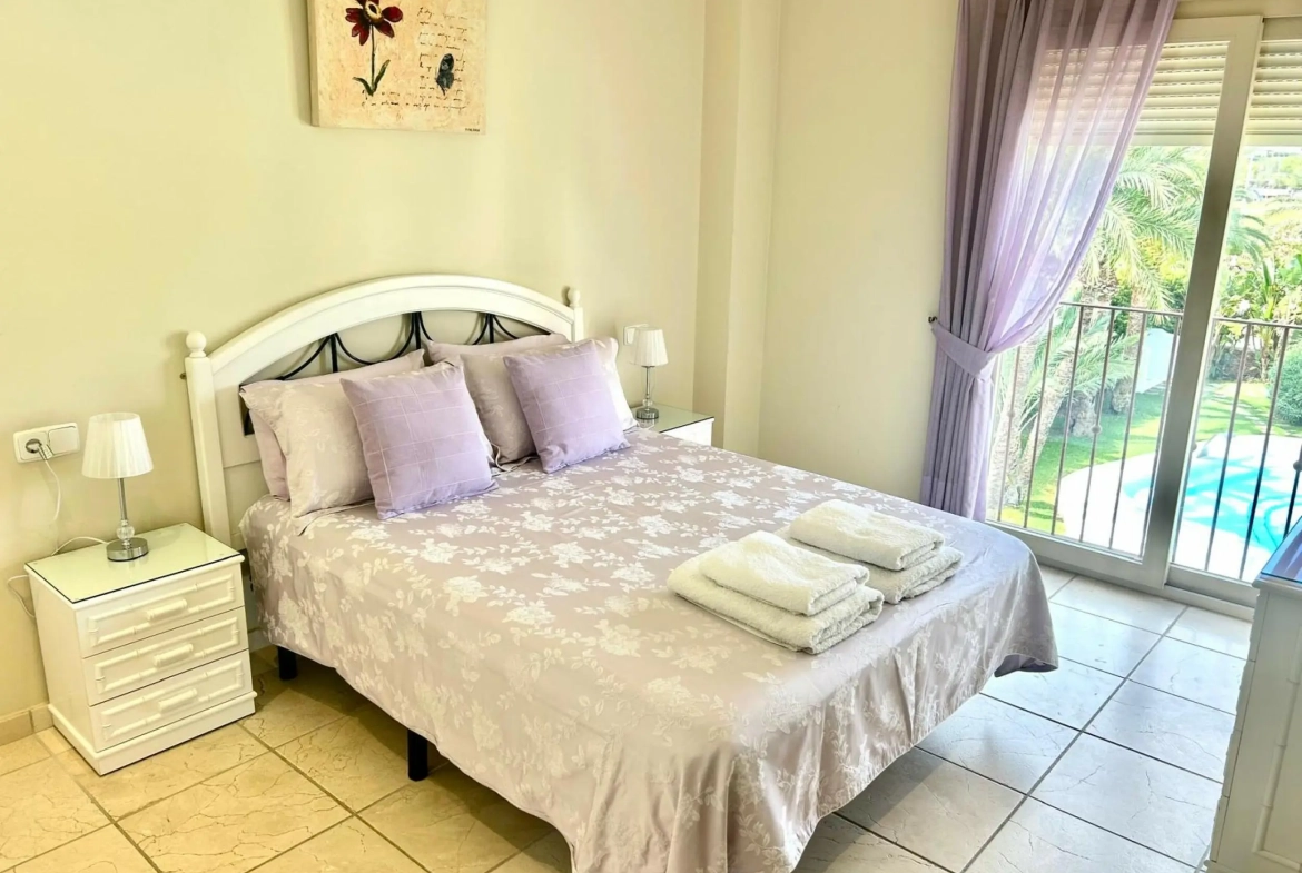 The thoughtfully designed layout includes two spacious double bedrooms accessed via an inner hallway. The master suite features an elegant en-suite bathroom and serene views overlooking the communal pool and landscaped gardens. A second full family bathroom serves the property.